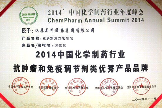 11月26日在廣州召開“2014中國化學制藥行業年度峰會”。會議圍繞“質量·誠信·品牌”主題,邀請政府相關部門負責人和有關專家出席并作主題演講,同時發布優秀企業和優秀產品品牌榜。江蘇吳中醫藥集團有限公司獲得“2014年中國化學制藥行業工業企業綜合實力百強”,其產品“匹多莫德口服溶液(芙露飲)”獲得抗腫瘤和免疫調節劑類優秀產品品牌。