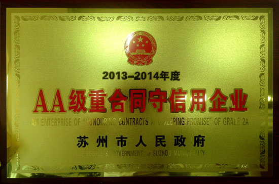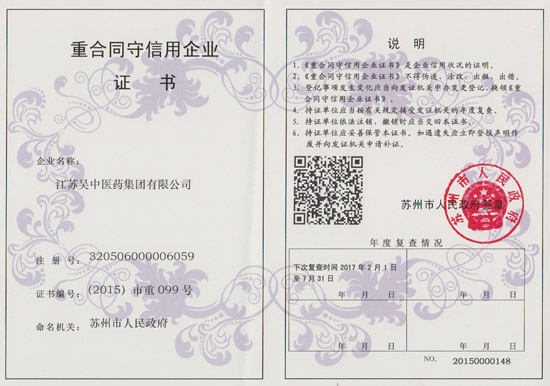 江蘇吳中醫藥集團有限公司獲得蘇州市重合同守信用企業,公司將進一步提高企業的誠信意識和信用管理水平發揚成績,開拓進取,為全市經濟社會發展作出積極貢獻。