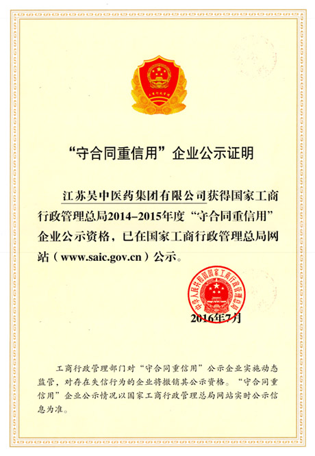江蘇吳中醫藥集團有限公司獲得國家級“守合同重信用”企業公示資格
