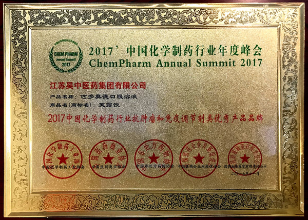 2017 年11月14日,由中國化學制藥工業協會、中國醫藥商業協會、中國非處方藥物協會、中國醫藥企業發展促進會、國藥勵展展覽有限責任公司共同主辦的“2017中國化學制藥行業年度峰會”在廈門舉辦。 峰會上,江蘇吳中醫藥集團有限公司再次獲得“2017中國化學制藥行業工業企業綜合排名百強”的殊榮,同時公司獨家產品芙露飲(匹多莫德口服溶液)獲得“抗腫瘤和免疫調節劑類優秀產品品牌”,江蘇吳中醫藥集團將繼續努力,齊心協力,共同推動制藥行業品牌建設,保障人民群眾用藥安全有效。