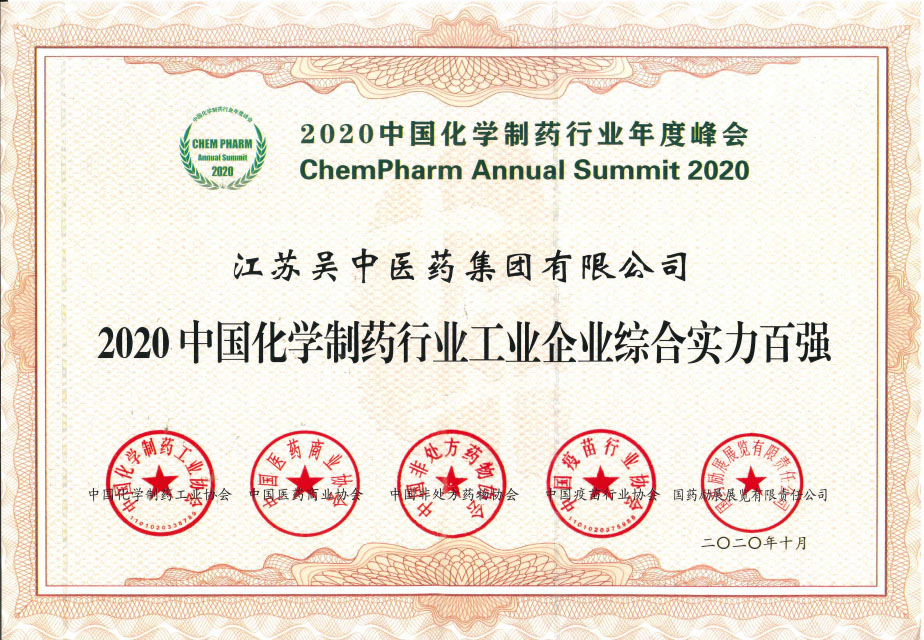 憑借過硬的產品質量、誠信為本的經營管理與持續推進的品牌建設,江蘇吳中醫藥集團有限公司榮獲“2020中國化學制藥行業工業企業綜合實力百強”。