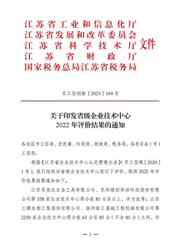 5月16日,江蘇省工信廳下發《關于印發省級企業技術中心2022 年評價結果的通知》(蘇工信創新〔2023 〕169 號),公布了2022年度省級企業技術中心評價結果,江蘇吳中醫藥發展股份有限公司通過了省級企業技術中心評價,并獲評“優秀”。