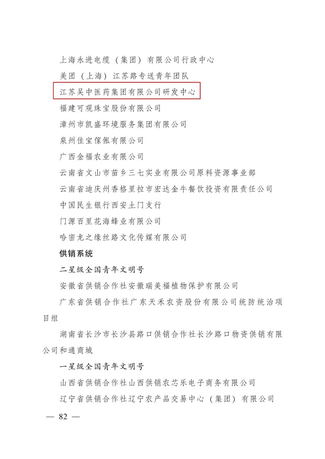 近日,共青團(tuán)中央等23家全國(guó)創(chuàng)建青年文明號(hào)活動(dòng)組委會(huì)成員單位聯(lián)合印發(fā)《關(guān)于命名第21屆全國(guó)青年文明號(hào)并進(jìn)行星級(jí)認(rèn)定的決定》。江蘇吳中醫(yī)藥集團(tuán)有限公司研發(fā)中心獲評(píng)為“一星級(jí)全國(guó)青年文明號(hào)”。