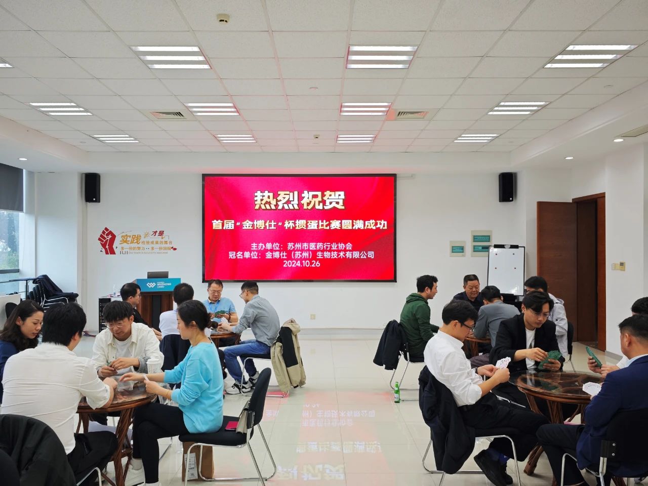 為了豐富會員的業余文化生活,增進會員之間的溝通交流,提升協會凝聚力,10月26日,蘇州市醫藥行業協會“金博仕”杯第一屆摜蛋比賽在江蘇吳中大廈舉辦,來自16家會員單位的32位選手參與角逐。本次比賽由蘇州市醫藥行業協會主辦,會員單位—金博仕(蘇州)生物技術有限公司提供贊助!