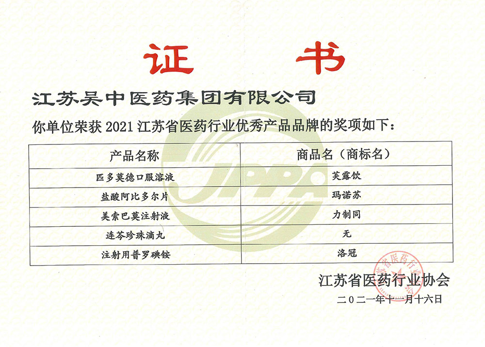 吳中醫(yī)藥五項產(chǎn)品榮獲江蘇省醫(yī)藥行業(yè)優(yōu)秀產(chǎn)品品牌